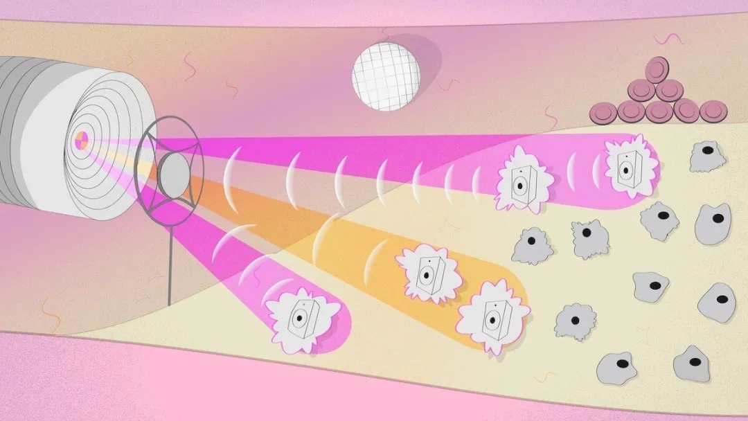 这是一个艺术家对光声探头的印象,使用的是由类似这样的研究开发的技术。探针进入血管检查动脉粥样硬化斑块的成分。该设备将组成细胞暴露在不同波长的光下,因此它们不能静止不动,并用麦克风接收产生的振动。来源:Pavel Odinev/Skoltech